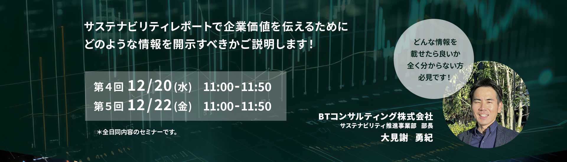 近年、ESG経営の重要性が高まり、上場企業にはサステナビリティ情報の開示が求められています。サステナビリティレポートを発行したことがないという企業様へ向けたオンラインセミナーを開催!