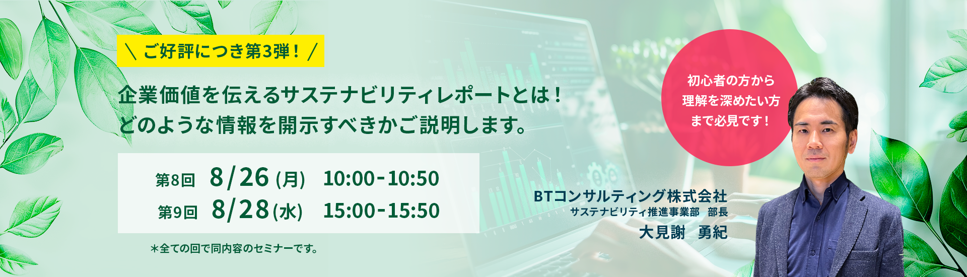近年、ESG経営の重要性が高まり、上場企業にはサステナビリティ情報の開示が求められています。サステナビリティレポートを発行したことがないという企業様へ向けたオンラインセミナーを開催!